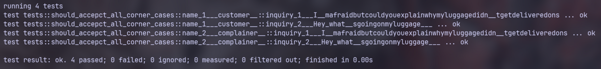 rstestは裏でマクロを展開し、それぞれのテストケースに対して専用の関数を生成します。これにより、forループを使用したテストと比較すると、どのassertionが落ちたかを関数名から瞬時に知ることができるようになります。forループを利用したテストで問題であった、どのassertionが落ちているか瞬時にはわかりにくいという問題はこれによって解消されます。